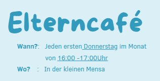 Hinweis: Das Elterncafé findet stets am 1. Donnerstag im Monat statt . Kinder dürfen gerne mitgebracht werden 🙂