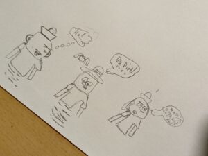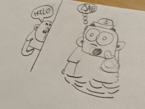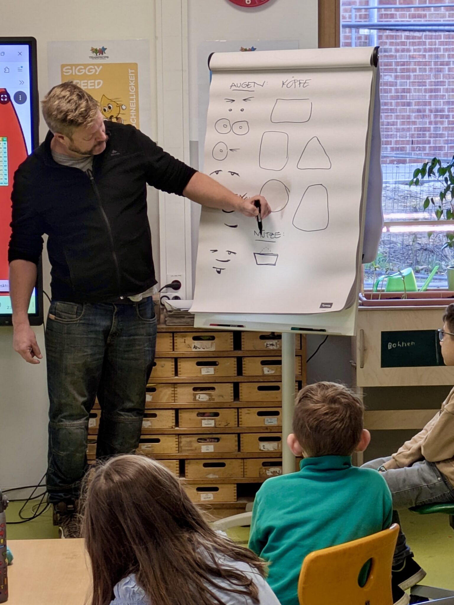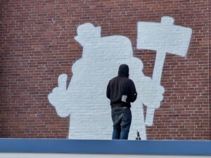 Herr Roloff zeigte uns ein paar Bilder von Straßenkünstlern aus Hamburg. Graffitis, Mosaike, Installationen… alles cool! Aber wer verdammt sind diese cringen schwarz-weißen Gestalten, die uns, Fische, Flaschen oder Schilder haltend, von den Wänden und Mauern auf St.Paulis Straßen, anglotzen und anschielten? Als uns Herr Roloff aufklärte, dass es sich um die „Freaks“ vom Hamburger Künstler Rebelzer handelte, war uns sofort klar: „Den müssen wir haben!“