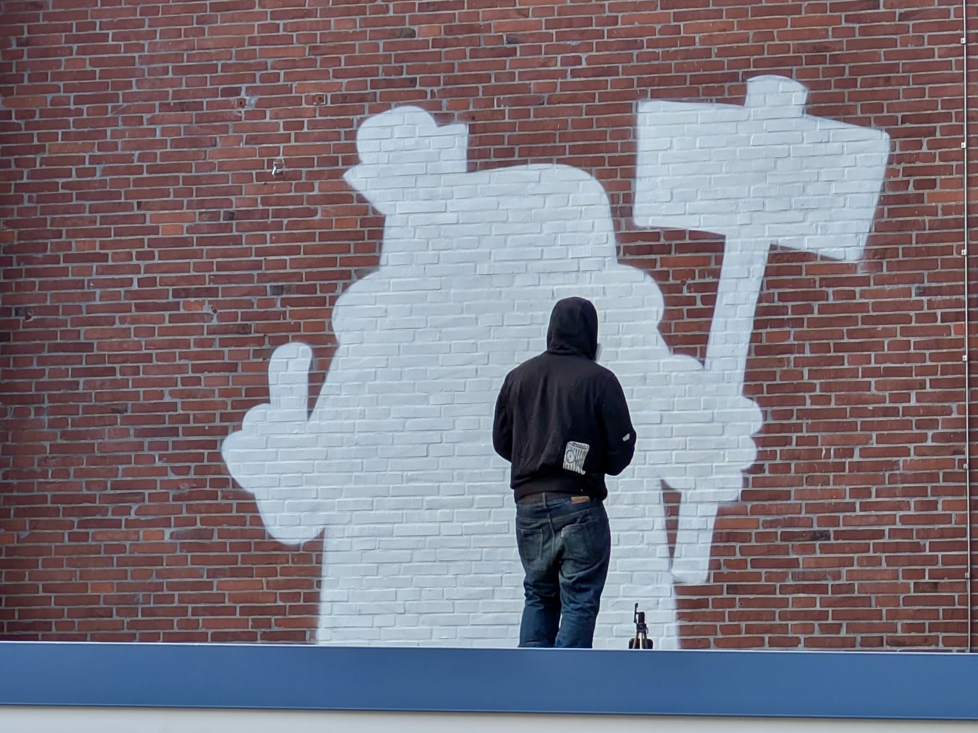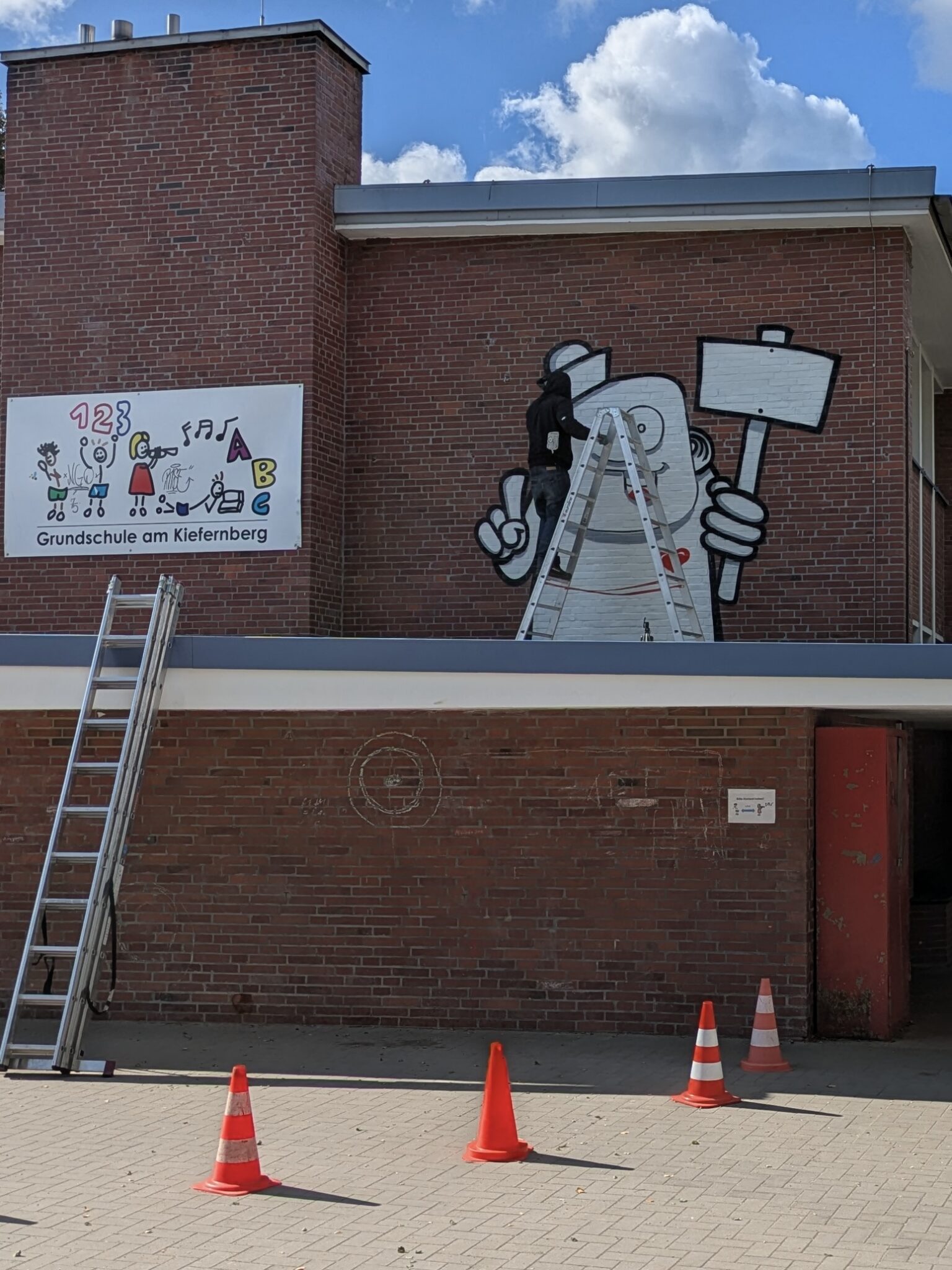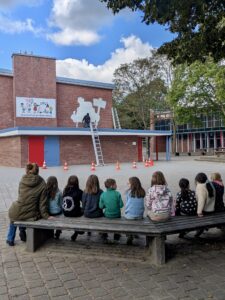 „Rebelzer“ kam stilecht auf seinem Motorrad an, erzählte seine spannende Künstlergeschichte und brachte uns in kleinen Schritten bei, eigene kleine Freaks zu zeichnen. Er gab uns hilfreiche Tipps, schrieb geduldig Grußworte und Autogramme und beantwortete vor allem unsere ganzen Fragen, bevor er sich dann daran machte, seinen eigenen, großen Freak auf unsere Schulwand zu sprayen.